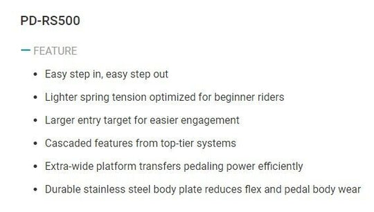 PD-RS500 FEATURES Easy step in, easy step out Lighter spring tension optimized for beginner riders Larger entry target for easier engagement Cascaded features from top-tier systems Extra-wide platform transfers pedaling power efficiently Durable stainless steel...Regular price $63.99 -